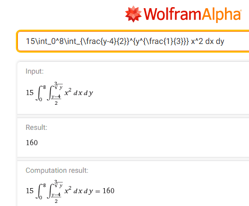 &=\int_{0}^{8} \int_{{(y-4)}/2}^{y^{1/3}} 15x^2\,dx \\