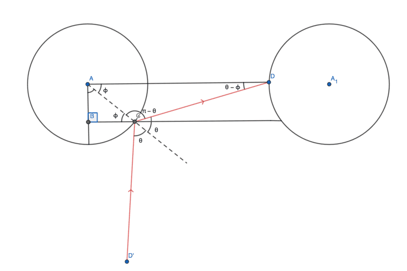 It bounces from there at an angle ##(1+2\frac DR)\alpha## to L, do you see that?