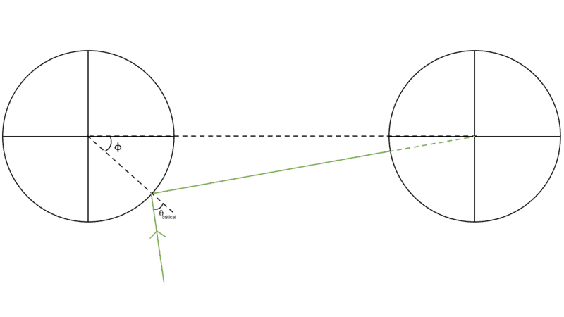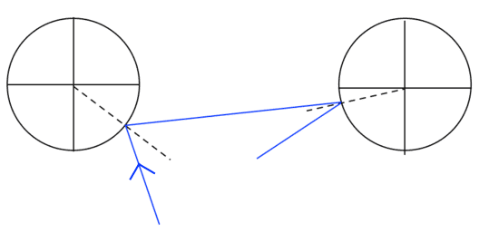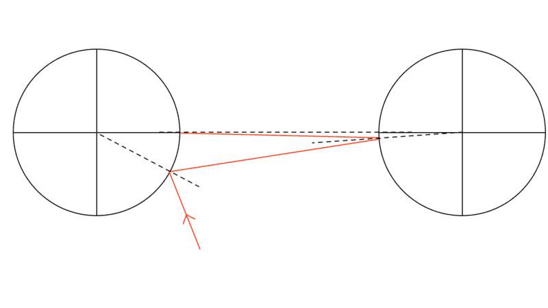 From 1, it hits 2 roughly Dα from L, at a point subtending angle DRα to that line at the centre of 2.