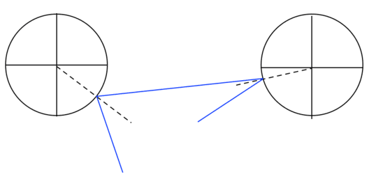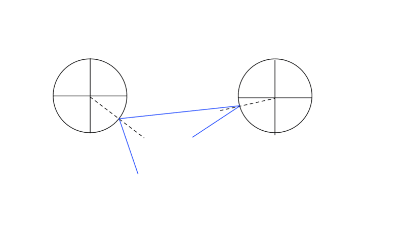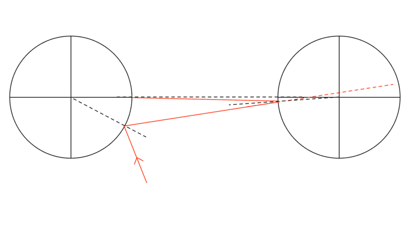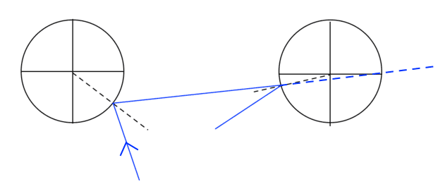 From 1, it hits 2 roughly ##D\alpha## from L, at a point subtending angle ##\frac DR\alpha## to that line at the centre of 2.