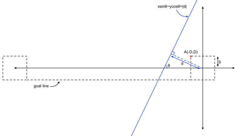 Here the path passes through the centre of the far post and on rebounding off the far post, the path of the ball retraces itself.