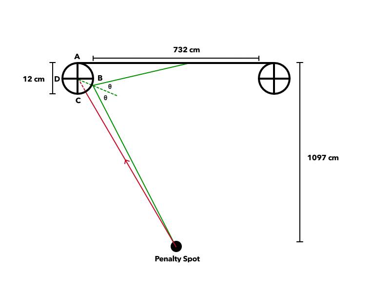 The distribution of incoming balls is not relevant for the question that I (and from what I understand @kshitij as well) am asking, although it may be more representative of reality. My question is simply: Which goal post allows for a bigger angle for a goal to be scored after reflection – square or circular? And of course, find the exact critical angle. The image below explains why I believe the square post allows for a 90-degree angle resulting in a goal while the circular post allows for π/2 + θ. θ is what I am trying to find.