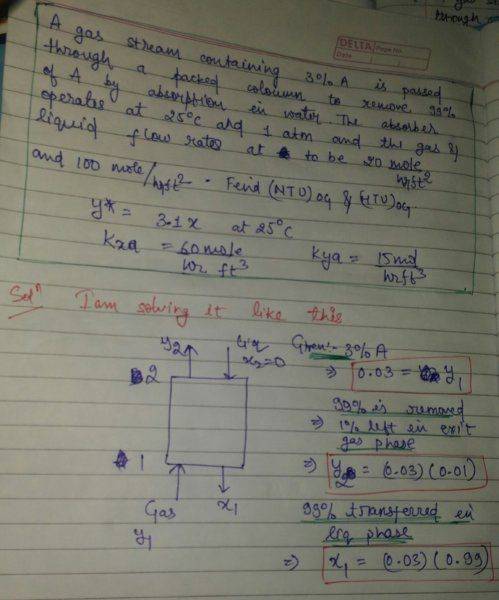 A gas stream containing 3% A is passed through a packed column to remove 99% of A by absorption in the water . The absorber operates at 25 degree Celsius and 1atm and the gas and liquid rates are to be ##20\frac{mol}{hr ft^2}## and ##100\frac{mol}{hr ft^2}##. Find the ##(NTU)_{OG}## , ##(HTU)_{OG}##.