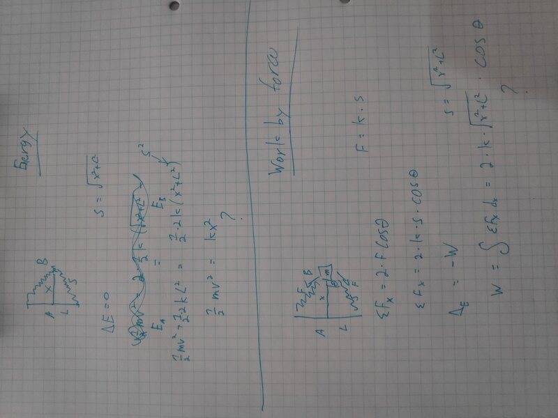 I know i need to use the spring energy formula but not sure how to do it at an angle. Will i have to multiply it by the angle of the spring. Or calculate the difference in length between the two positions