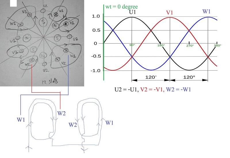 There are 12 slots. Each phase contain 2 coils. I have showed how the coils are connected for the phase W at the bottom.