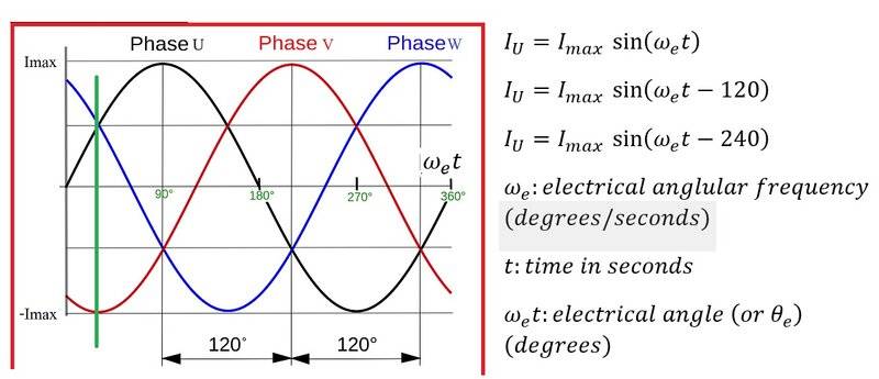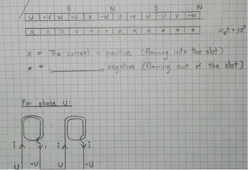 The waveform belongs to current of each phase. For notations, when the current is entering the slot W1 (crossed symbol in the hand drawing), the same current leaves the slot W2 (dotted symbol in the hand drawing).