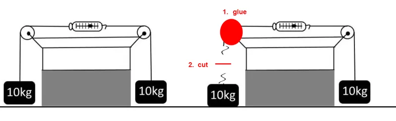 • A participant proposes a scenario where the left pulley is fixed and the left weight is cut, suggesting that the scale should still read 10kg.