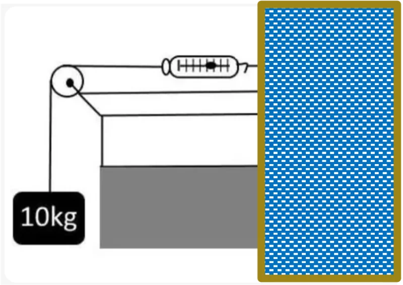 The figure on the right shows a 10 kg hanging mass connected to a spring scale by a string going over an ideal pulley. The system is at equilibrium. A screen hides what's beyond the scale to the right.