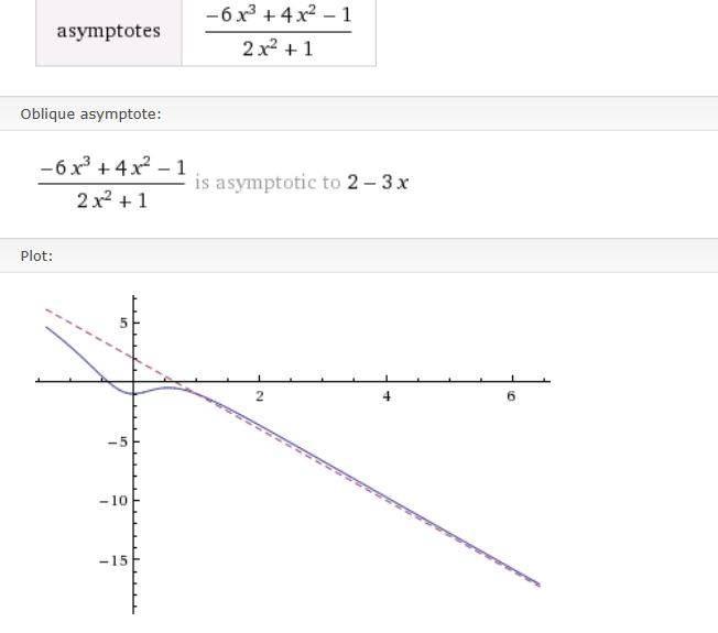 The correct slant asymptote for the function \(\frac{-6x^3 + 4x^2 - 1}{2x^2 + 1}\) is \(y = -3x + 2\). This conclusion is derived from performing polynomial long division, which reveals that the function approaches the linear equation as \(x\) approaches infinity. Although the function never actually reaches the asymptote due to the presence of a non-zero remainder, the asymptote is significant as it describes the end behavior of the function. Understanding this concept clarifies the relationship between polynomial degrees and their asymptotic behavior.
