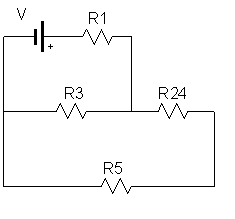In the circuit below find the current I3 (in A) when R1 = 26 Ω, R2 = 52 Ω, R3 = 36 Ω, R4= 25 Ω, R5 = 162 Ω, and V = 80 V.