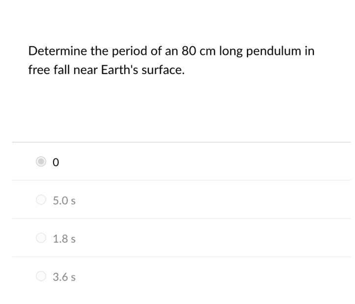 The forum discussion centers on the confusion surrounding the period of a pendulum in free fall, specifically addressing the question posed in an AP Physics 1 course regarding an 80 cm long pendulum. Participants clarify that when the pendulum is in free fall, the acceleration due to gravity (g) is effectively zero, leading to an infinite period (T) rather than zero, as the pendulum does not exhibit simple harmonic motion (SHM) under these conditions. The relevant equation for the period, T=2π√(L/g), confirms that with g=0, the period becomes undefined, highlighting the need for precise wording in physics problems.