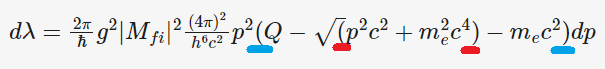 ## d\lambda = \frac{2\pi}{\hbar}g^{2} |M_{fi}|^{2} \frac{(4\pi)^{2}}{h^{6}c^{2}} p^{2} (Q - \sqrt(p^{2}c^{2} + m_{e}^{2}c^{4}) -m_{e}c^{2})dp##