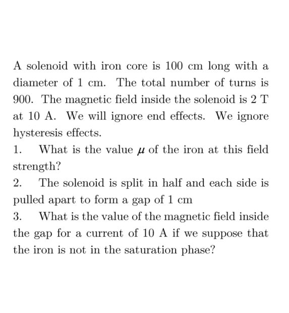 I think there is not much you can do. You can continue to choose to use a relatively simple approximation method to calculate. In any case, the problem itself has already been mentioned to ignore the end effects and hysteresis effects. As you can imagine, this question only require approximate numerical answer. Or if you think the professor will not mind, you can try to ask the professor some questions in your mind.godiswatching_ said:It’s from a practice midterm I was trying to solve. Sadly the professor does not provide solutions. I am assuming it is somewhat important if it is in a practice test.