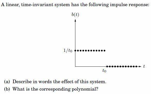 For part A I have "The effect of this system consists of an input of value 1/t0 which then has a “jerk” at t=0 and drops down to 0", however I'm not sure if that's what the book wants for an answer.