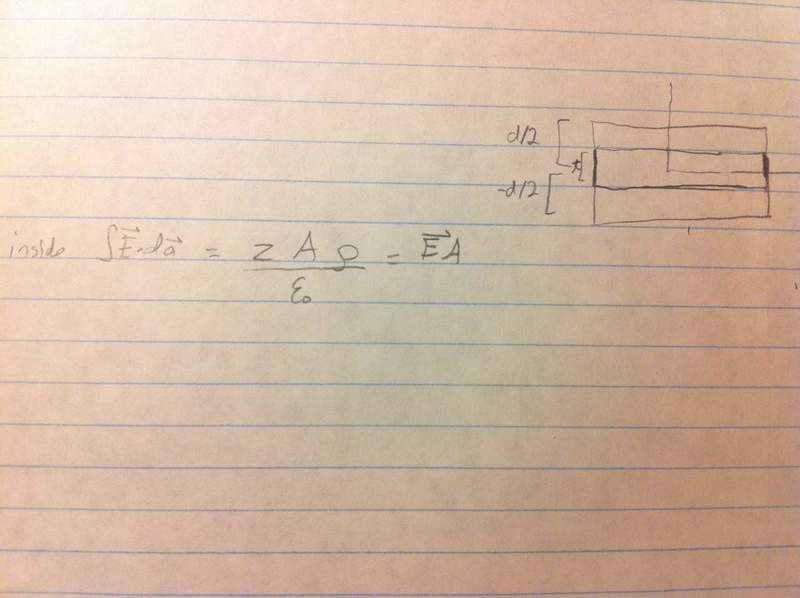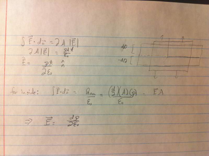 Find the electric field produced by a uniform density plane of thickness d. This slab is very large in the x and y planes, extends from –d/2 to d/2 in z direction. Use Gauss’s Law. Note there are 3 regions.