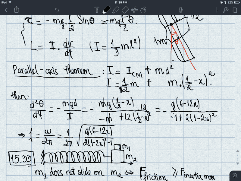 - Participants discuss the moment of inertia and its calculation about the axis of rotation, with references to the center of mass. There are questions regarding the interpretation of variables in the equations, particularly concerning the distance from the center to the pivot point.