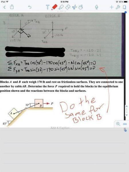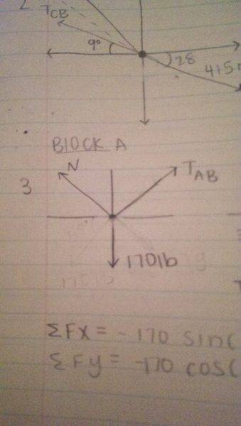 I drew both force diagrams like the hint suggested and then started to try to find ΣFx and ∑Fy for block A and I don't think I got very far since my numbers do not seem correct (you can see in the picture). I know I need to find tension on block A then from there use that to find P, however I don't know where the angle of block B fits in. In order to keep block B in equilibrium P has to cancel out an Fx components. Just a little stuck on getting there...