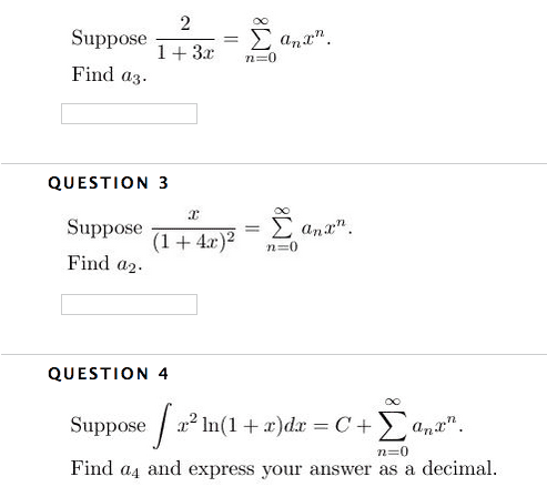 - One participant derives the series expansion for $\frac{1}{1-(-3x)}$ and discusses the implications for the value of $a_3$.