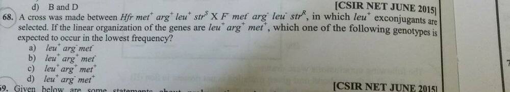 The genotype with the lowest frequency in the discussed context is genotype (d), which is determined to have a frequency of 0%. This conclusion arises from the impossibility of transforming recipient bacterial DNA with a DNA segment where only two terminal genes recombine while the central gene remains unchanged. The discussion emphasizes the significance of multiple crossover events during recombination, as illustrated in figure 9-10 from the NCBI resource.
