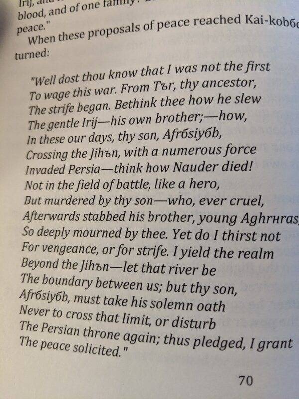I'm reading a translation of the shahnameh, which says that Afrasiab was a Turanian leader, who upon failed invasions of Iran, retreats beyond the Jihun river. But wikipedia says