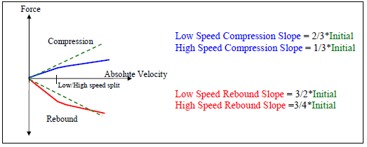 From what I've been reading a damping ratio of about 0.2 is suitable for a passenger car to maximize comfort in bump. I am aware that just working with that damping ratio all throughout the force velocity curve is not ideal because the ride can be very uncomfortable at high velocities and I am also aware that the damping should be higher during rebound compared to bump. Currently I am trying to work towards a force velocity curve that has a similar profile as shown in the attachment I've uploaded. However, I am having difficulty determining how much more damping I want in rebound compared to bump as well as where I should have the split between high and low velocity.