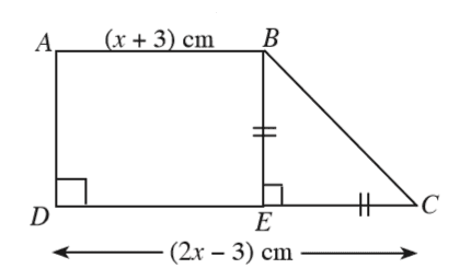 In the trapezium ABCD shown in the figure, AB = (x + 3) cm, DC = (2x − 3) cm and BE = EC. If the area of the trapezium is 15 cm2, find the length of DC to the nearest first decimal place.