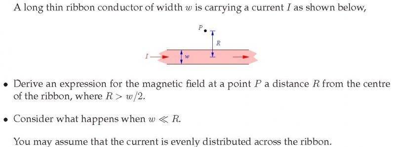I've been meaning to do this question for a while now but don't have much of a strategy. I was informed that the ribbon should be treated as a series of parallel wires. The magnetic field at an arbitrary point P from a wire with a current flowing through it can be given by the biot-savart law. The magnetic field at a point P a distance r away from a single long wire is thus given by: