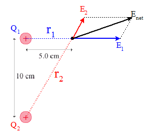E1 = (8.99*10^9)(3*10^-9C)/(.05m)^2 = 10788 N/C