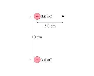 Two +3.0nC charges are shown in the diagram below which are spaced 10cm apart. What are the strength and direction of the electric field at the position indicated by the dot in the figure (Figure 1) ?