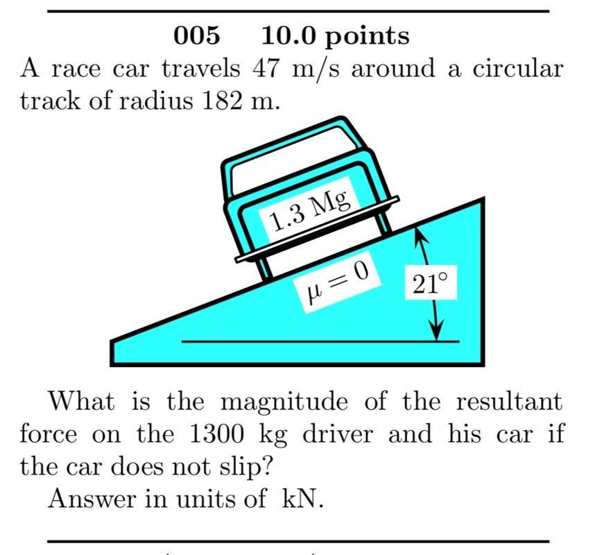 - A race car travels 47 m/s around a circular track of radius 182 m which is banked at an angle of 21 degrees. Assuming the track is frictionless, what is the magnitude of the resultant force on the 1300 kg driver and his car if the car does not slip?