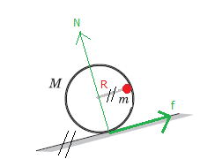- A thin rod of mass m is welded on inner surface of a thin-walled pipe of mass M parallel to the axis of the pipe. The composite body thus formed is placed on a uniform slope as in the figure. Inclination of the slope is adjustable. Find range of coefficient of friction between the pipe and the slope for which the body slides down without rotation.