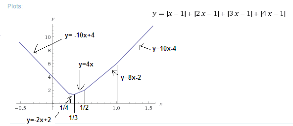 If we have $y=|x-1|+|2x-1|+|3x-1|+|4x-1|$ and we plot its graph, we see that we need to break the absolute function into 5 intervals: