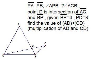 very good !Opalg said:[sp]The circle centred at $P$ with radius $PA = PB$ passes through $C$ (angle at centre = twice angle at circumference). Extend $BP$ to form a diameter $BE$ of the circle. Then $AD\cdot CD = BD\cdot DE = 1\cdot (8-1) = 7$.[/sp]