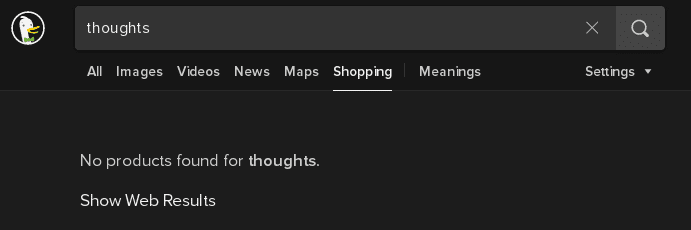 I tried ordering thoughts, but it turns out that there are no hits for "thoughts" in Shopping, at least with DuckDuckGo.