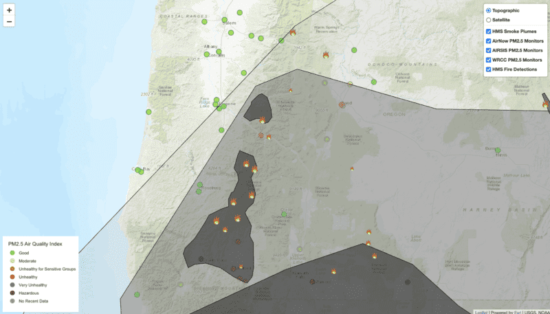 Here is a link to a map of fires, air quality, and smoke plumes.