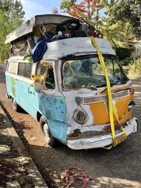 Notice the expandable foam all over the place, including holding the pine cone where the right headlight should be, sealing windows.