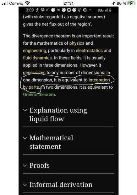 b) In a three-dimensional situation, a volume integral of a divergence of a vector field can be transformed into a surface integral (Gauss’s theorem). What is the one-dimensional counterpart? Answer: Integration by parts