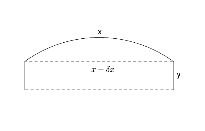 What will happen is that since the membrane can't stretch but it can bend the distance between the ##x## sides will change from ##y## to ##y-\delta y##. Now I have to and want to find the shape of the bended membrane.