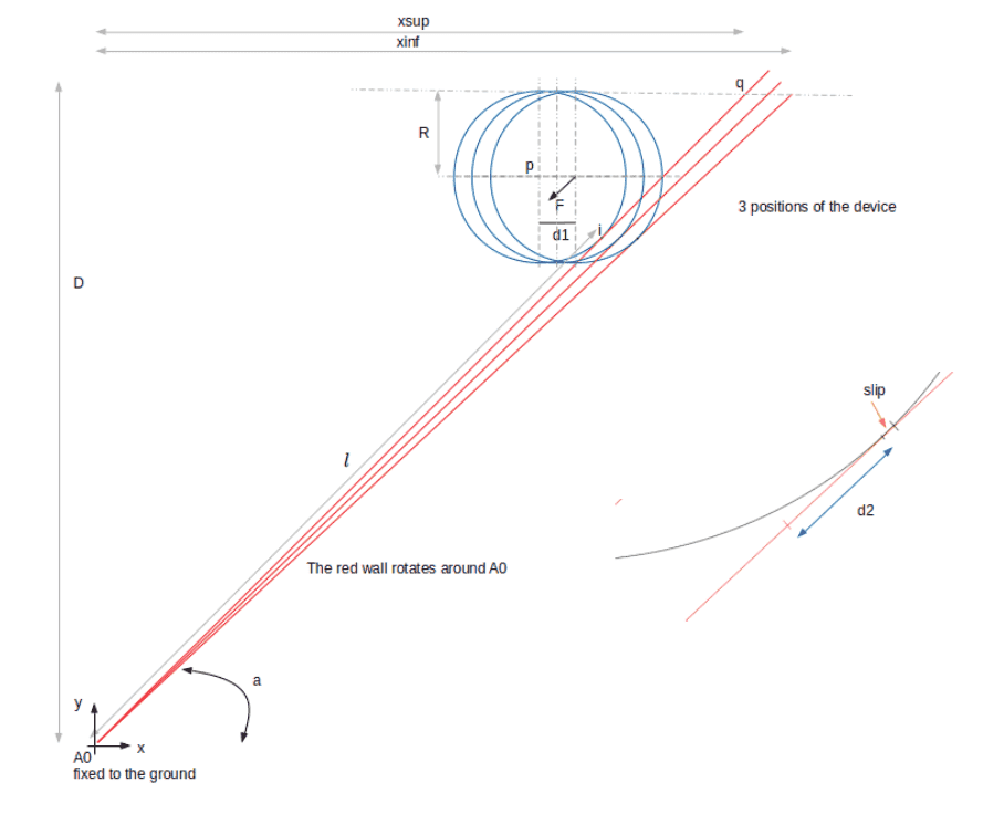 I drew 3 positions of the device with a small angle of rotation of the wall. And I drew an enlargement of the dot of contact: