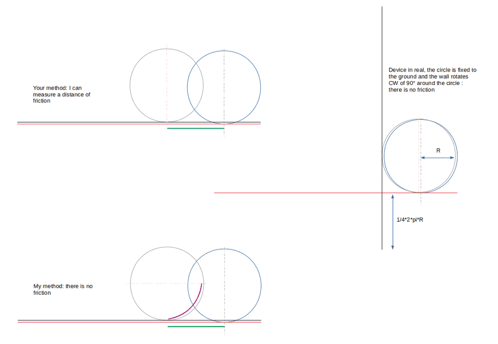 And I measured d1. Again, you forgot something very important: the position of the dot of contact from start to end: from a fixed dot on the circle for example. It is easy to watch the problem: take a circle fixed on the ground. Rotate a wall around the circle without any sliping (there is friction but there is no heating), you can see a distance moved by the distance measured but like the dot of contact moved the same distance: there is no slip, so no heating. Here, I took at start d2 because it is logic for me, but with the construction you will have d1 but you need to take in account the distance moved by the dot of contact (in reference to a fixed dot on a part of the device) and at final I have : d1-(d1-d2).