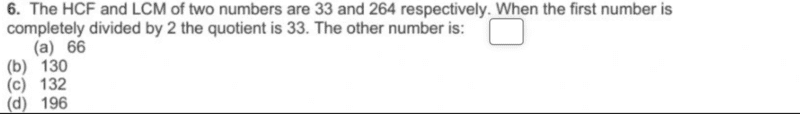 ok, one of the numbers is ##66= 2×3×11## we are told that the hcf = ##33=3×11## therefore, ##11 and 3## would constitute part of the other unknown number, also lcm {264] = {2×2×2×3×11}