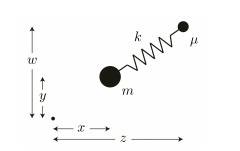 A planar object comprises of two masses joined by a linear spring with relaxed length p. The horizontal and the vertical displacements of the two masses are measured relative to a fixed point of reference as shown in the figure. What would be the potential energy of the spring?