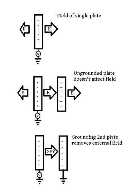 Anyhow when we ground the second plate, we have changed from a single plate capacitor to a parallel two-plate capacitor.