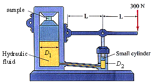 The pressure on the sample in a hydraulic press is determined using Pascal's law, which states that pressure applied to an enclosed fluid is transmitted undiminished throughout the fluid. In this scenario, a force of 300 N is applied to a lever connected to a small cylinder with a diameter of 3.0 cm, while the sample is placed on a larger cylinder with a diameter of 13.0 cm and an area of 4.0 cm². The discussion emphasizes the importance of understanding torque and equilibrium in calculating the force exerted by the cylinder on the fluid, leading to the conclusion that the pressure on the sample can be calculated using the relationship between force, area, and the dimensions of the cylinders involved.