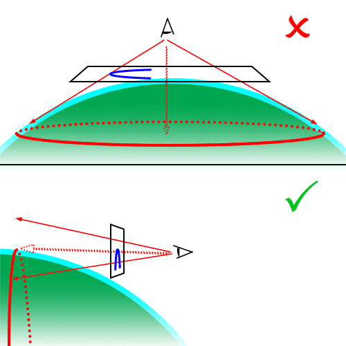 In the upper diagram, which you've marked with an X, the red line represents the horizon. In the second diagram the red line does not represent the horizon. The red line below the apex would be hidden behind the horizon. The horizon must be symmetrical in all directions. If it's an ellipse, then what defines the major and minor axes?