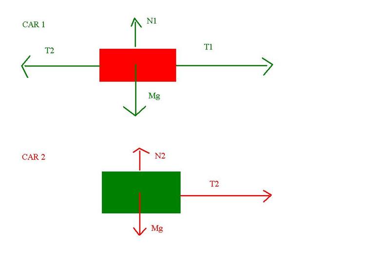 A train locomotive is putting two cars of the same mass behind it. Determine the ratio of the tension in the coupling between the locomotive and the first car(FT1) to that between the first car and the second car (FT2), for any nonzero acceleration of the train.