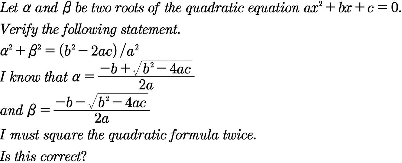 The discussion focuses on the relationship between the roots and coefficients of a quadratic equation, specifically expressed through Vieta's formulas: $\alpha + \beta = -\dfrac{b}{a}$ and $\alpha \cdot \beta = \dfrac{c}{a}$. It also explores the derivation of the sum of squares of the roots, $\alpha^2 + \beta^2 = \dfrac{b^2 - 2ac}{a^2}$, using algebraic manipulation. The conversation highlights that while this topic is typically reserved for advanced precalculus courses, it is a valuable concept for understanding quadratic equations in depth.