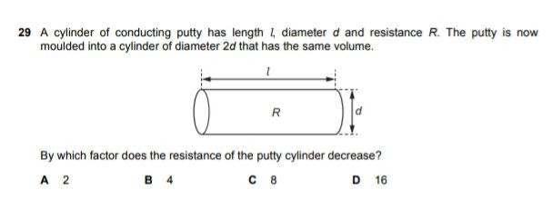 The discussion revolves around the resistance of a wire when its diameter is doubled, particularly in the context of a Cambridge IGCSE exam question. Participants explore the implications of changing the diameter on resistance, considering both direct current (DC) and alternating current (AC) scenarios, as well as the relationship between volume, length, and cross-sectional area.