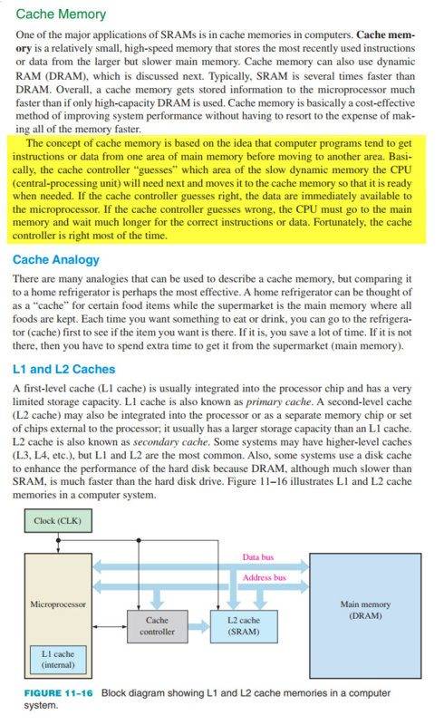 "The concept of cache memory is based on the idea that computer programs tend to get instructions or data from one area of main memory before moving to another area. Basically, the cache controller “guesses” which area of the slow dynamic memory the CPU (central-processing unit) will need next and moves it to the cache memory so that it is ready when needed. If the cache controller guesses right, the data are immediately available to the microprocessor. If the cache controller guesses wrong, the CPU must go to the main memory and wait much longer for the correct instructions or data. Fortunately, the cache controller is right most of the time."