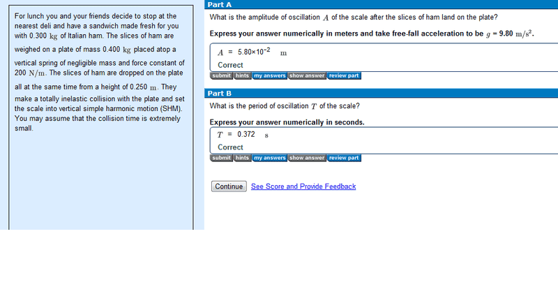 As you can see, I have solved the problem already but that was not without using several hints. Going through each hint at a time i solved the problem using conservation of energy after the collision. But but but! I don't agree with the energy assumptions they made. They made me use the elastical potentiel energy relative to the new equilibrium point as well as the kinetic energy and equaled that ½kA^2 where A denotes the amplitude.